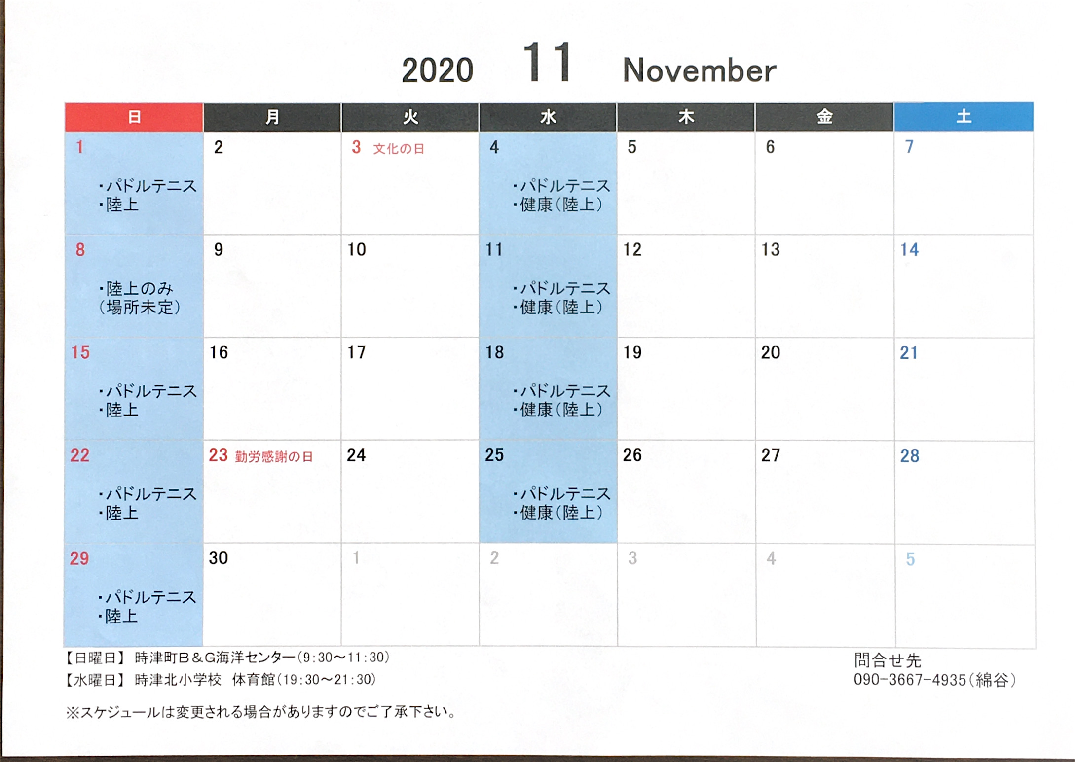 今年の実施内容はパドルテニス大会を行います。9:00に受付開始し、9:30開会、14:00頃閉会予定です。